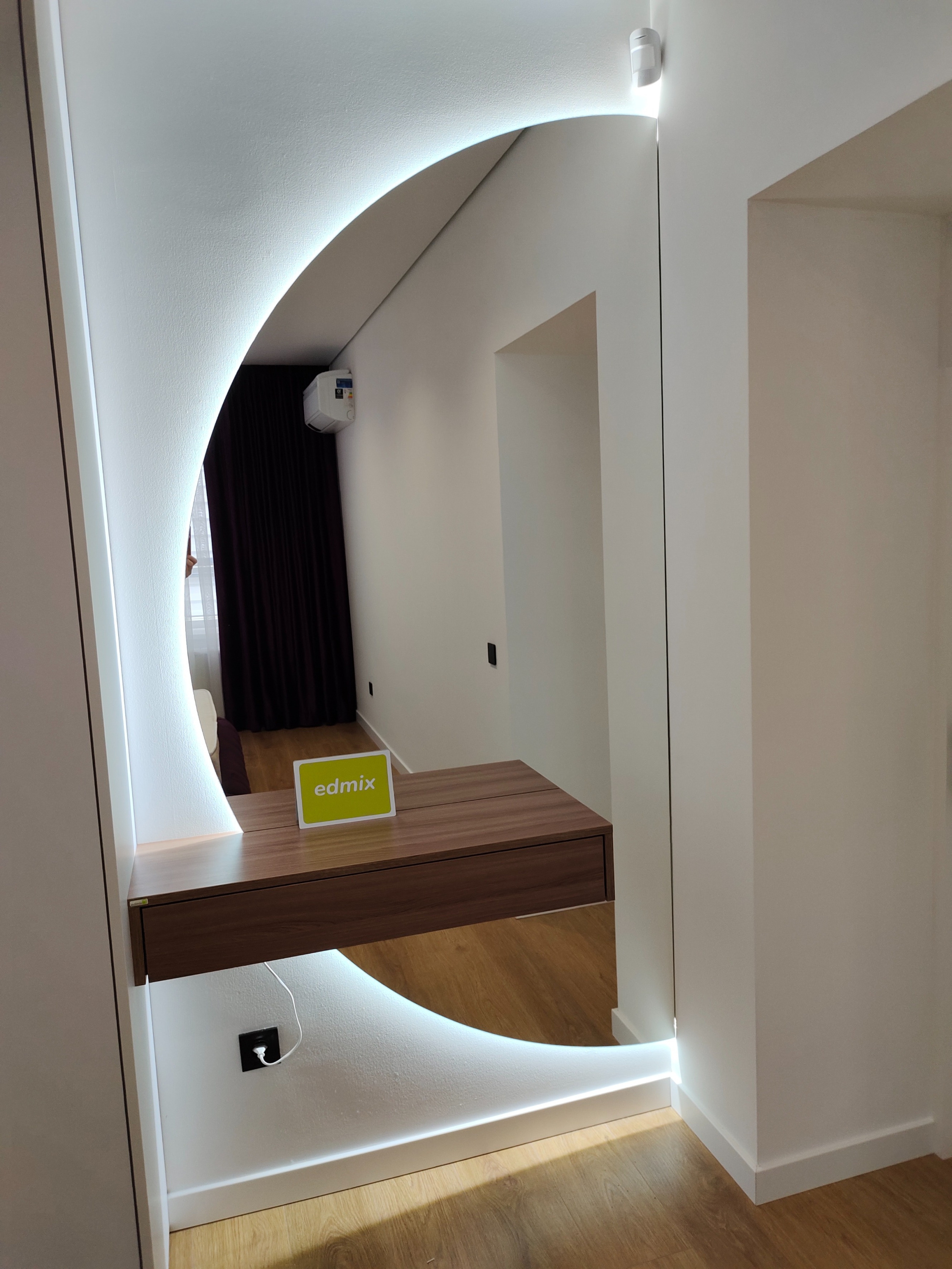 Ну а так як зазвичай: "чудове зеркало незвичайної як місяць форми (ох я з ним і намаявся! Один раз розбив і двічі міняв!) з космічним підсвічуванням доповнить загадковим сяйвом Ваш простір і зробить незабутнім Ваш вечір!